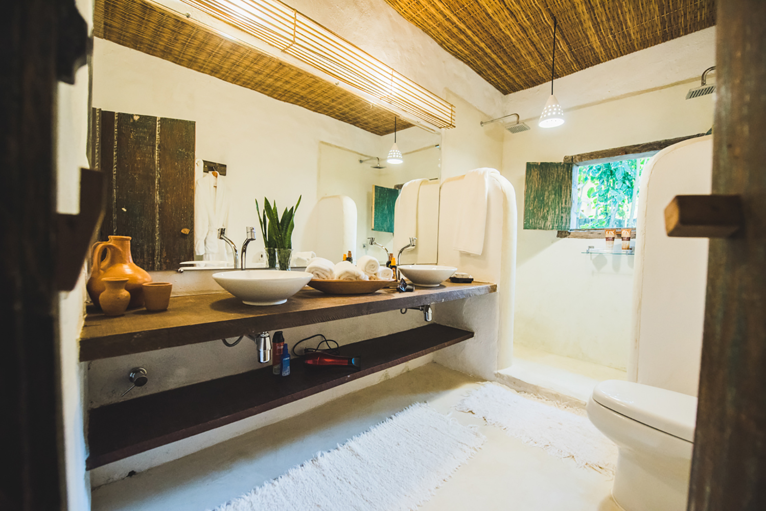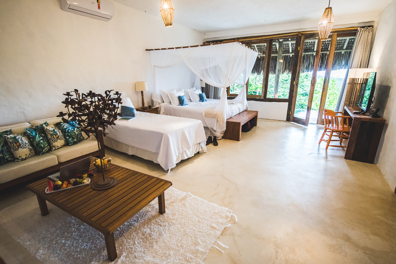 Além do conforto de um quarto completamente equipado e decorado com o melhor de Trancoso, a suíte tem um deck com uma piscina privativa imersa na natureza e vista para o mar.